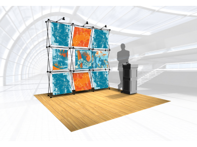 About when everyone thought that pop ups had just about completed its' life cycle, it suddenly gets reinvented with the marriage of lambda prints/uvdirect prints to the Xpressions Snap pop up displays framework. A rollable graphics is precisely finished with radius corners and outfitted with black rubber loops. All you need to do is attach each of the loops to each corner of your graphic and then to the hubs, and you have a perfectly suspended graphic. The great thing about this application is that you're able to still creatively weave and twist the graphic panels through the framework to make an outstanding presentation. Never worry about coming up with the right layout for your Snapshot display because Optima has already created some nice kit ideas for you.