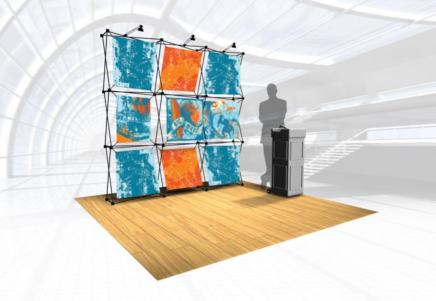 About when everyone thought that pop ups had just about completed its' life cycle, it suddenly gets reinvented with the marriage of lambda prints/uvdirect prints to the Xpressions Snap pop up displays framework. A rollable graphics is precisely finished with radius corners and outfitted with black rubber loops. All you need to do is attach each of the loops to each corner of your graphic and then to the hubs, and you have a perfectly suspended graphic. The great thing about this application is that you're able to still creatively weave and twist the graphic panels through the framework to make an outstanding presentation. Never worry about coming up with the right layout for your Snapshot display because Optima has already created some nice kit ideas for you.
