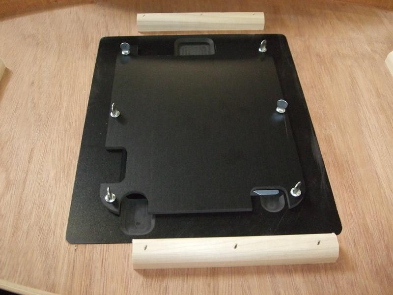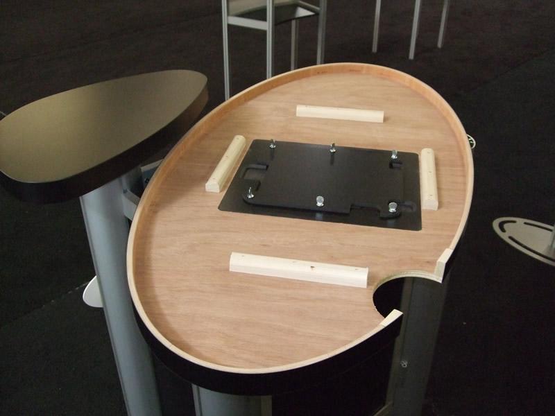 The tablet mounts below the counter top using thumbscrews, and the base is CNC cut for power and data cables. The tablet computer is surrounded by a lip which prevents anyone from casually removing it. In short . . . it’s attractive, secure, and an inexpensive addition to most counters or workstations.