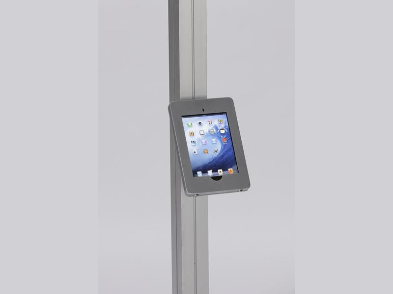 Adding an iPad to a hybrid display or extrusion exhibit has never been easier. The MOD-1316, 1317, and 1318 are designed to attach to many aluminum extrusion systems. The clamshell has two anti-theft locks for security. The 1317 and 1318 have the added benefit of the Swivel Stop™, which allows the iPad to swivel between portrait and landscape modes. There's even the option of a graphic overlay to personalize your iPad frame.