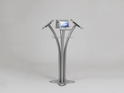 MOD-1338 iPad Kiosk: The Port Land iPad Kiosks are anything but dull. They are innovative, lightweight, and affordable. The locking clamshell frame rotates with the unique Swivel Stop feature, allowing you to seamlessly reposition your iPad to Portrait or Landscape mode. The kiosks are made from durable engineered aluminum and assembly in minutes. There are multiple single iPad kiosks. The MOD-1334 is designed for two iPads and the MOD-1338 for four iPads. All have integrated cord management.