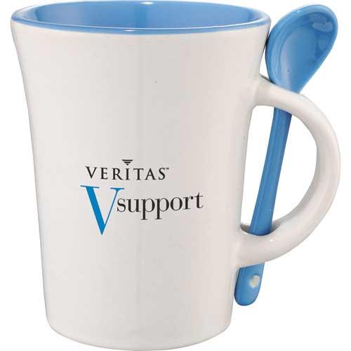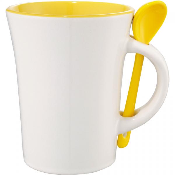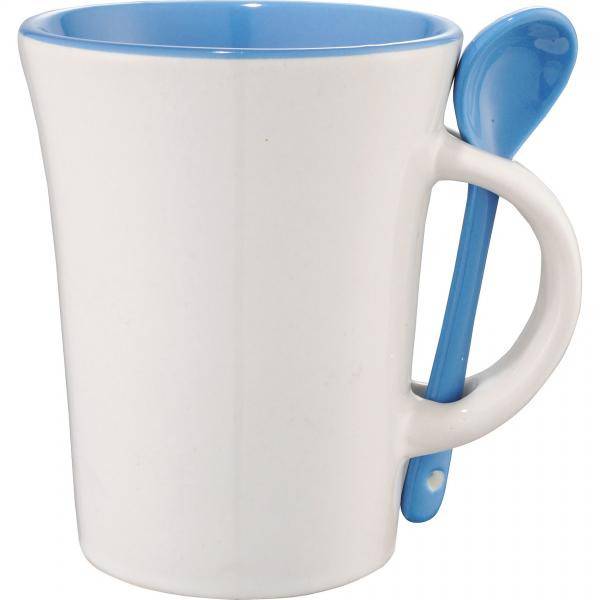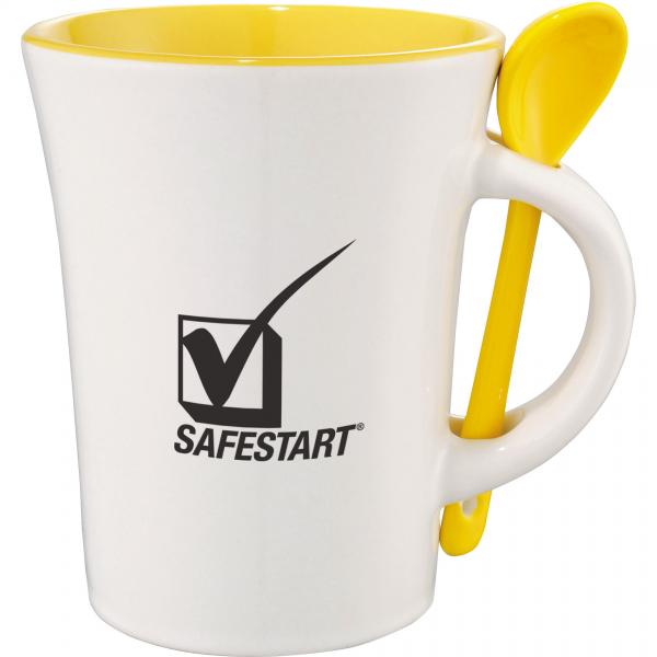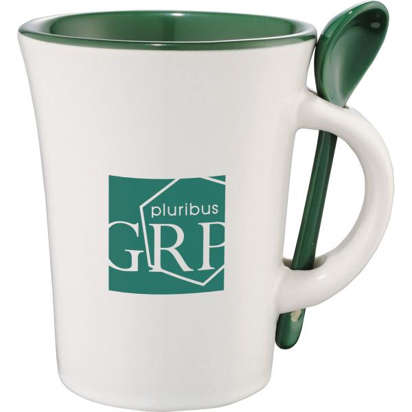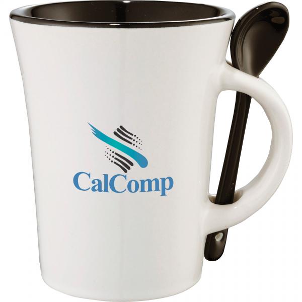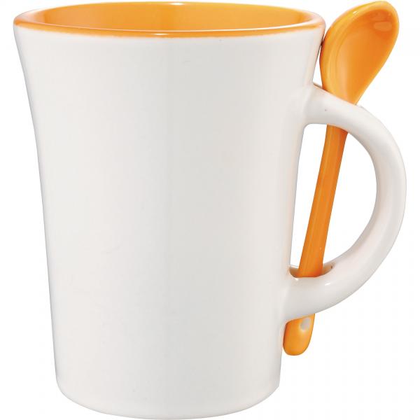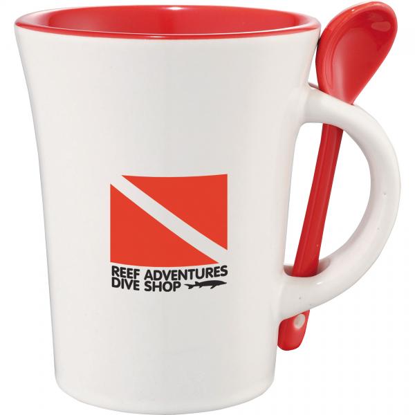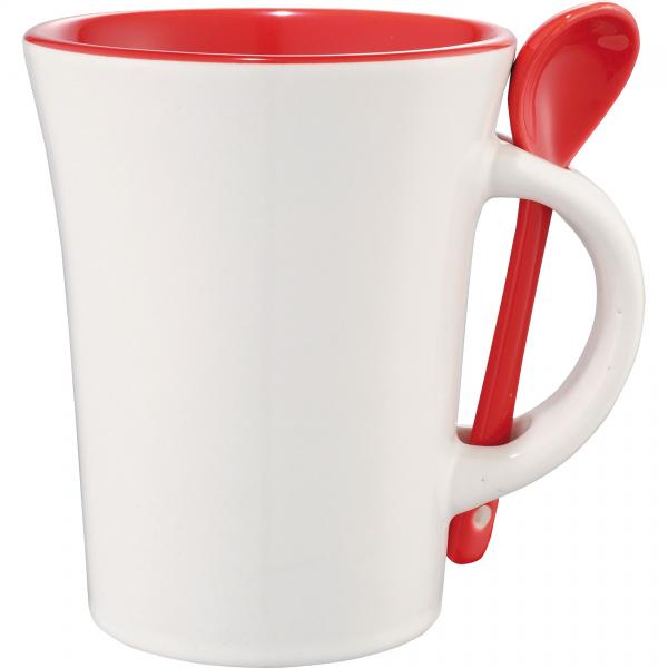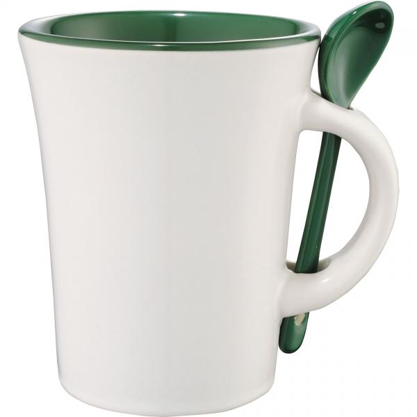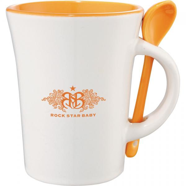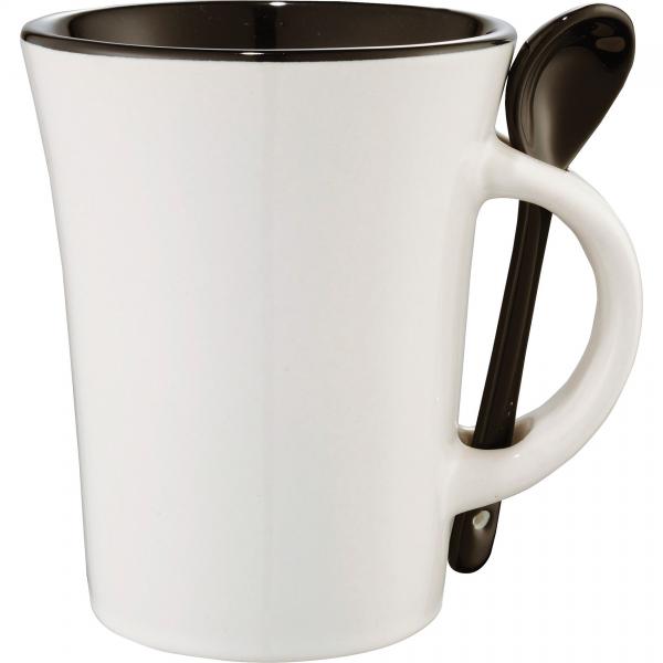 Tapered mug with mini-spoon that fits inside handle. Spoons not shipped inserted. See General Information page for special ceramic item handling charge. 10-oz.