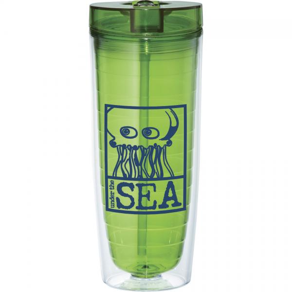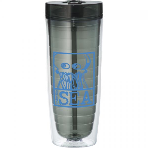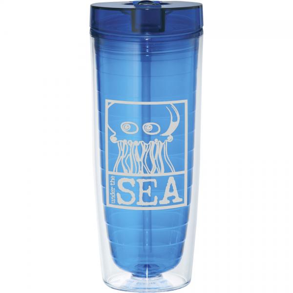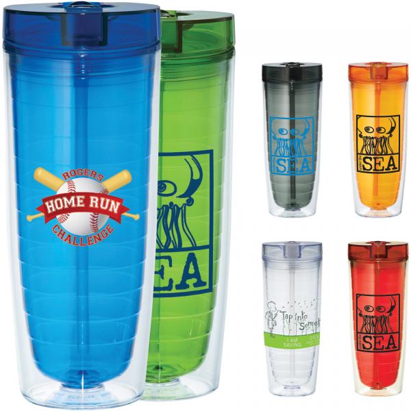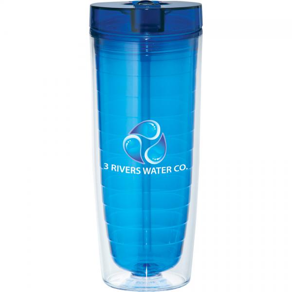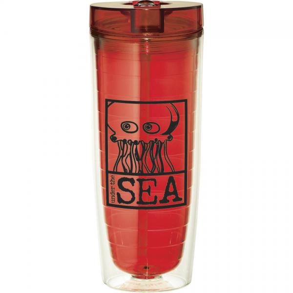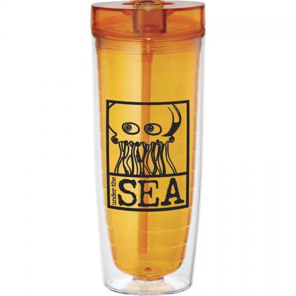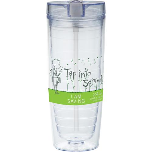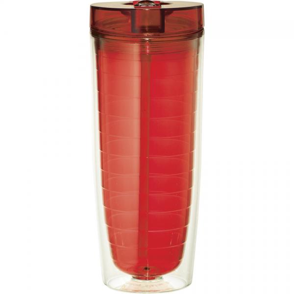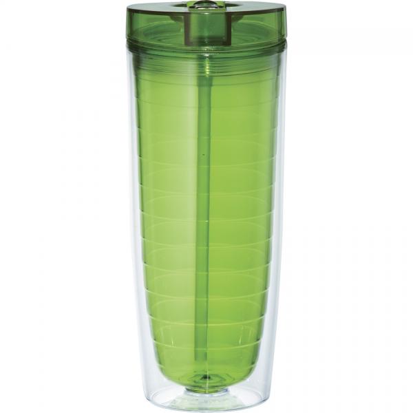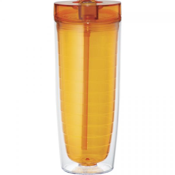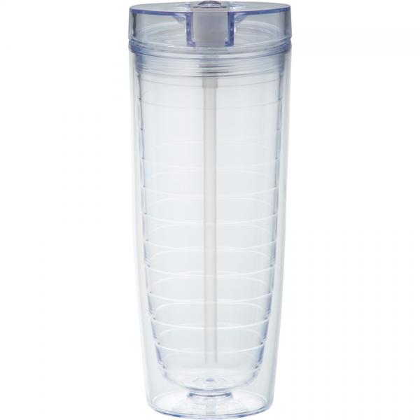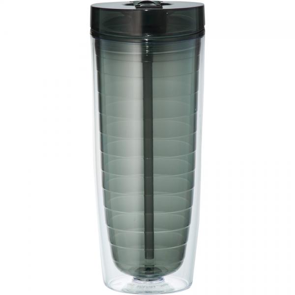 Some like it hot & some like it cold, with this patented two-in-one lid you can have both. Double-wall acrylic body with screw-on lid that has a pull up stopper for drinking hot beverages and an integrated pull up straw for cold beverages. BPA free. Leed's Exclusive. US Patent No.: US 8,672,174 B1. 20oz.