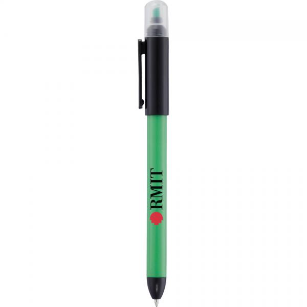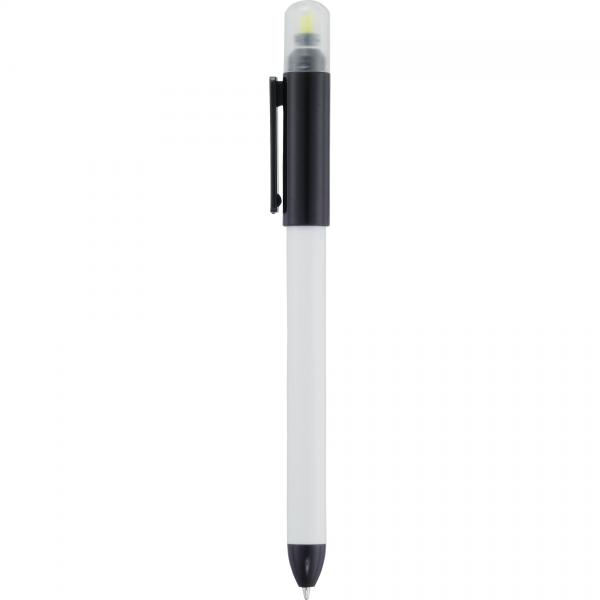 Dual-function. Twist-action ballpoint pen and highlighter with removable cap.