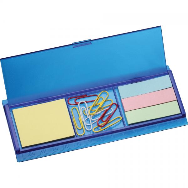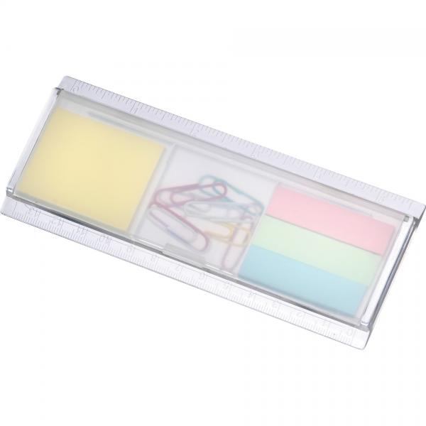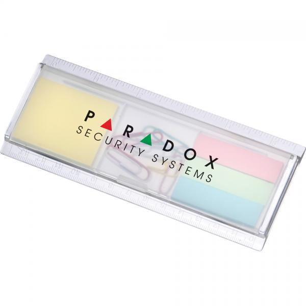 Includes 1-3/8" x 1-13/16" yellow sticky memo pad with 40 pages, sticky flags in 3 colors and paper clips.
