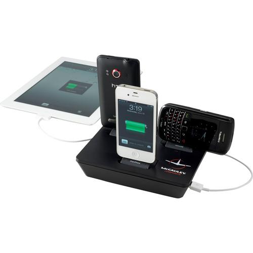 Customize IDAPT with your logo and then allow your end user to customize IDAPT for them. End users will see this item every day as they take their smartphone or device off of IDAPT for the day, and then drop it off every evening for charging. It has 3 charging points and an additional USB charging point, allowing users to charge their electronics without the mess of tangled cords or the need for more than one outlet. Ships with two 30 pin iPhone/iPod tips, two Micro USB tips, and a Mini USB tip. Also, includes a 20% discount card on a future tip purchase from IDAPT.