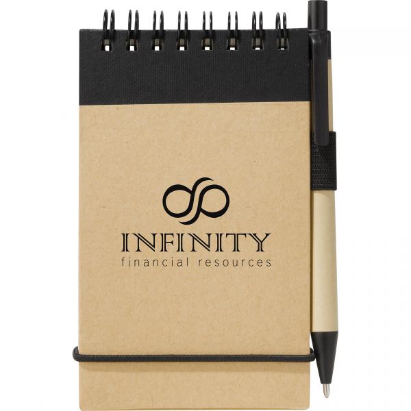 Jotter features recycled covers and pages. Includes matching recycled barrel ballpoint pen. Pen imprint not available. Pens packed separately.