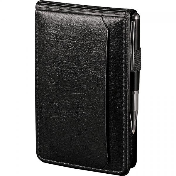 Front cover business card pocket. 3" x 4" unlined writing pad. Refills available at www.leedsworldrefill.com. Refill item number: 9091-66