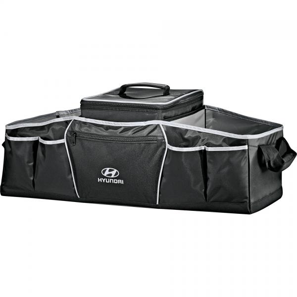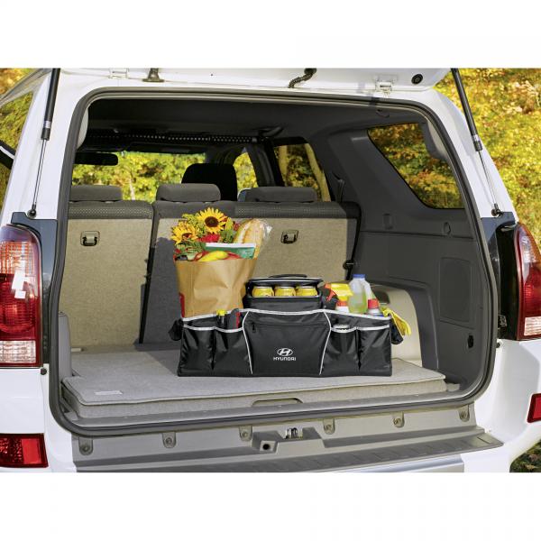 Combination cooler and trunk organizer is perfect for transporting groceries and keeping your car clean. Trunk organizer features three large sections. Multiple exterior gusseted pockets for additional storage. Comfort-grip handles. Removable cooler has a zippered main compartment, padded carry handle and insulated PEVA lining. All pieces fold flat for easy storage.