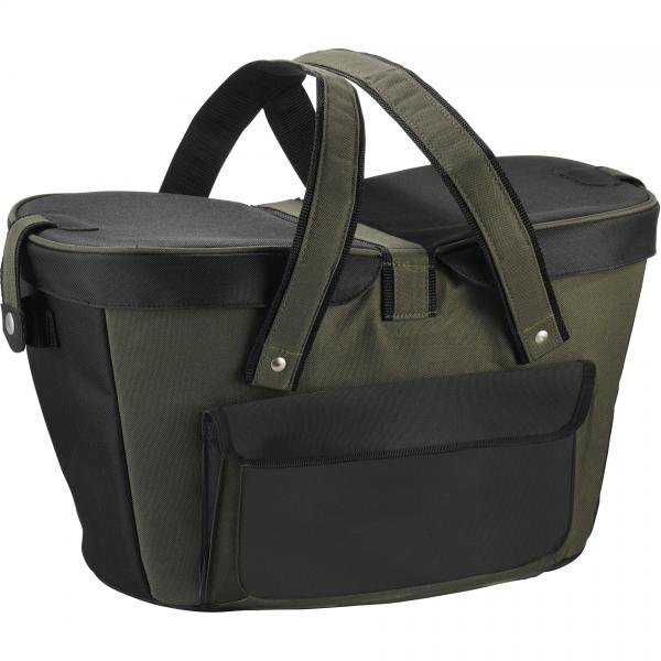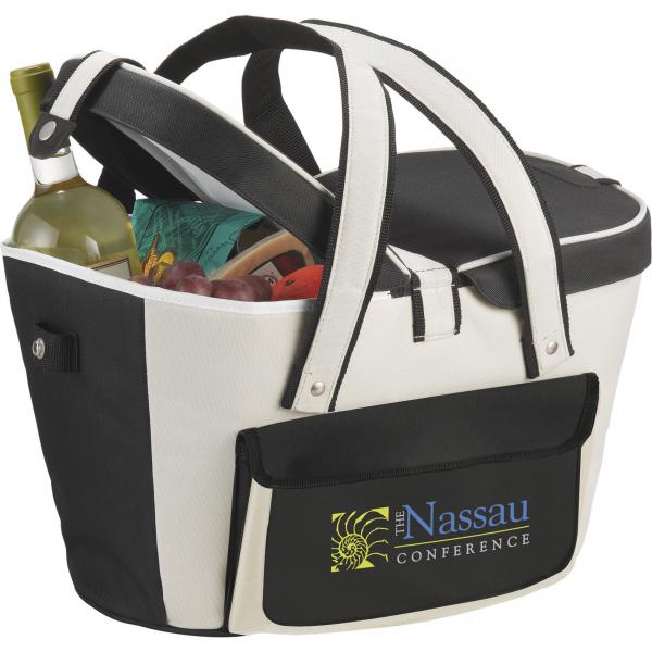 Unique picnic basket design holds up to 24 cans. 6" handle drop height. Insulated PEVA lining.