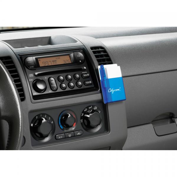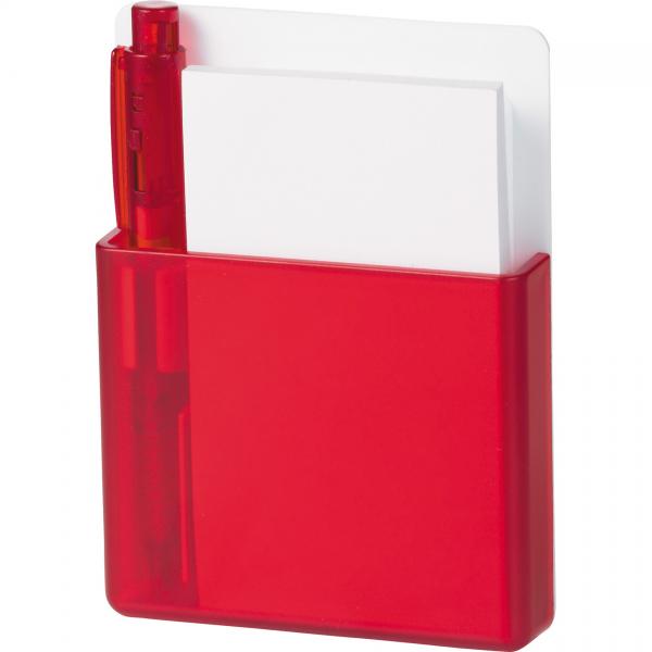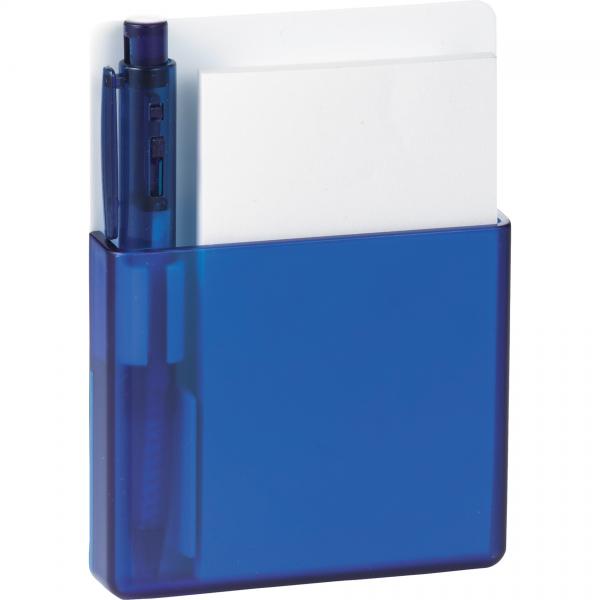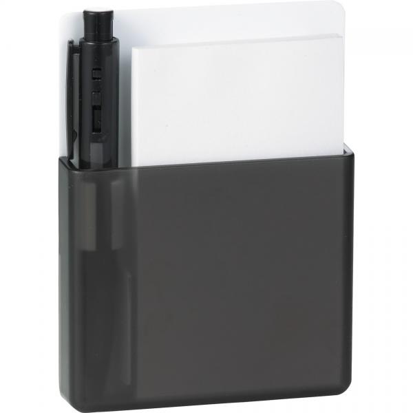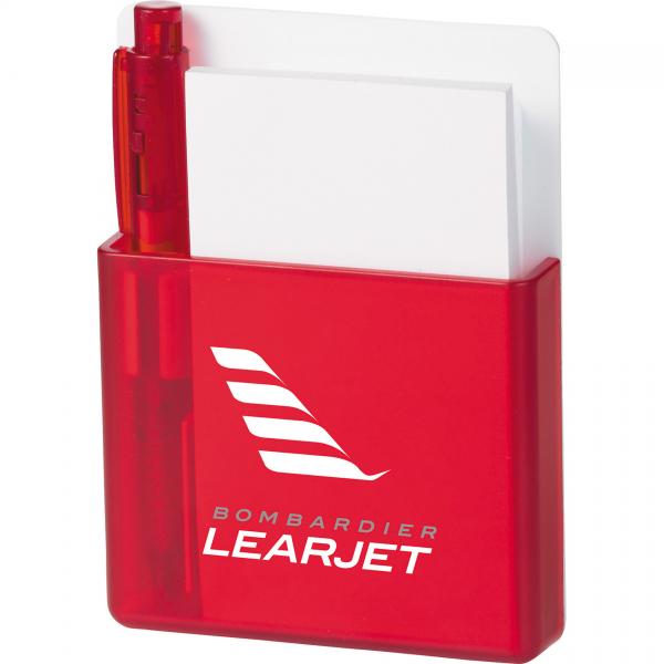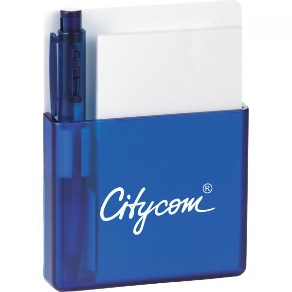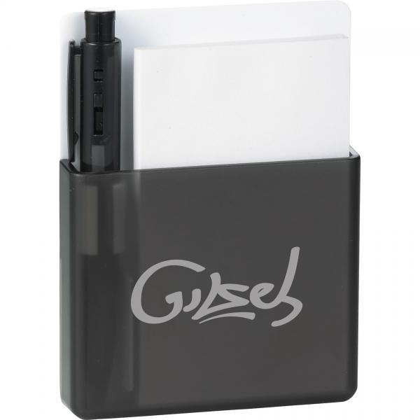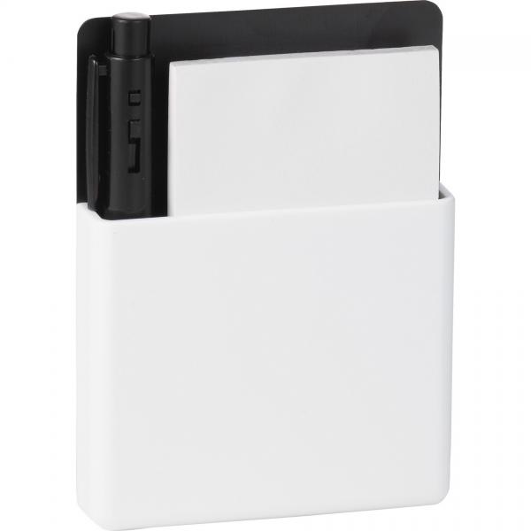 Notepad and pen. Detachable clip on back fits conveniently in the air vent of a car. Pen not available for imprint.