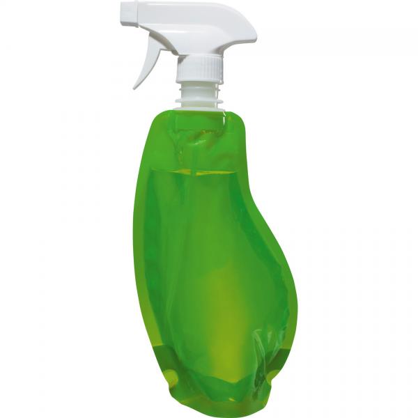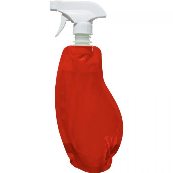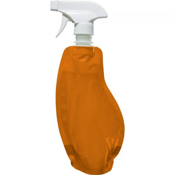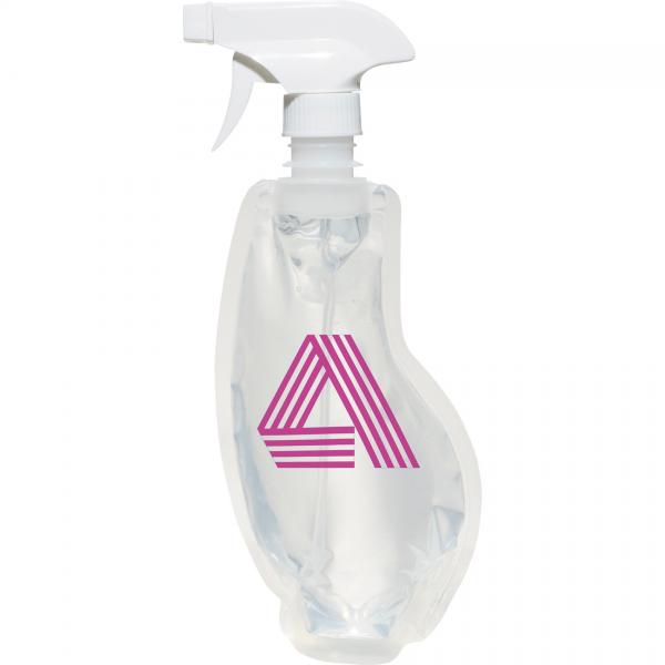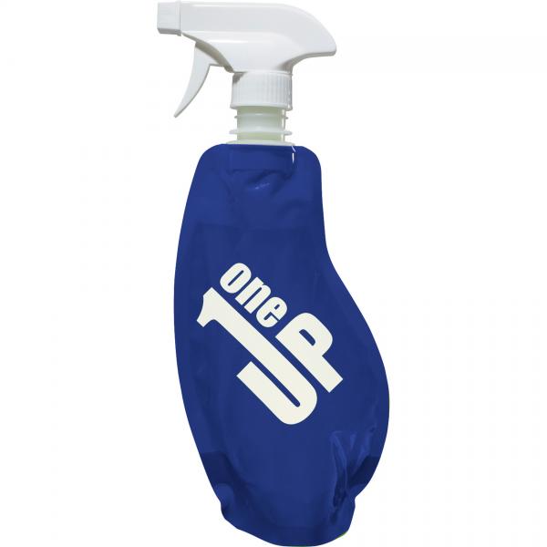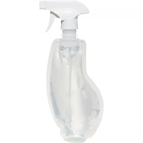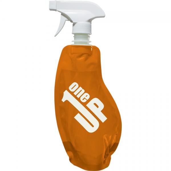 Laminated water bag. Includes a twist-on, spray nozzle to keep you cool on hot days. Capacity of pouch: 15.5 ounces.