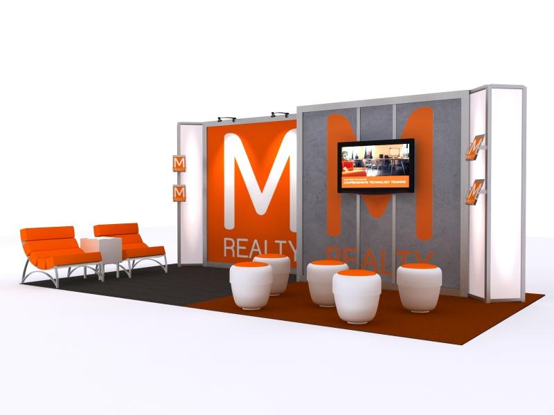 VK-2917 Hybrid Inline: On its most basic level, a trade show display is a billboard featuring your product or service. The "M" series supercharges this idea by designing a graphic billboard with tension fabric, monitors, presentation areas, and a conference room. As your company grows and your tradeshow requirements expand, the "M" series makes it easy to evolve from a 10 ft. to a 20 ft. to an island display because the structure and the graphics are designed to be interchangeable. Add iPad kiosks or counters for additional flexibility and storage.