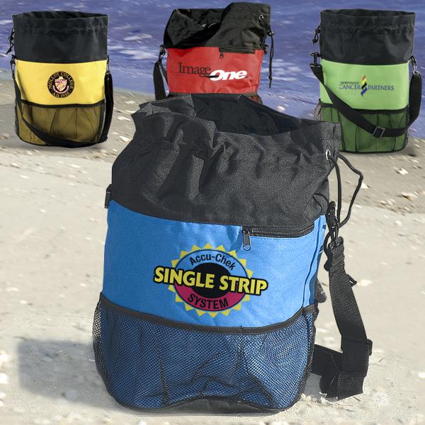 Sand Bag with Drawstring closure, adjustable toggle and adjustable clip-on shoulder strap.