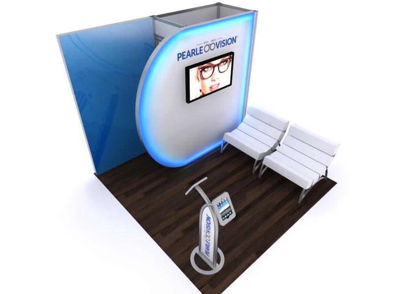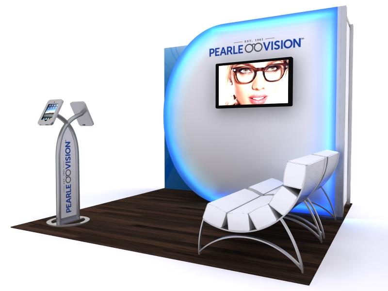 Lighting attracts attention, and subtle lighting like edge-lit graphics provides a soft, upscale appearance. The VK-1116 and VK-2957 demonstrate how a clean, visually strong exhibit with graceful curves can transform a modular inline into a custom-looking display. The Silicone Edge Graphics minimize the metal structure while focusing attention on the graphics and the monitor. Both configurations include ample storage, unusual in an inline. There's space for casual furniture and an attractive iPad stand for demos.