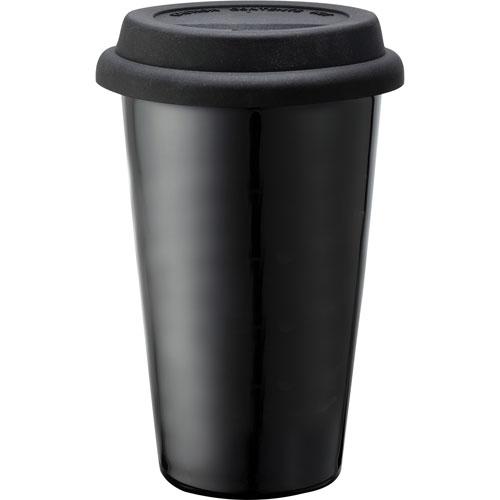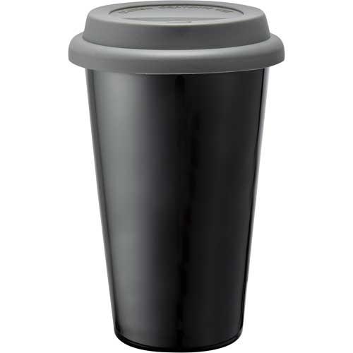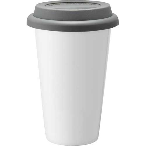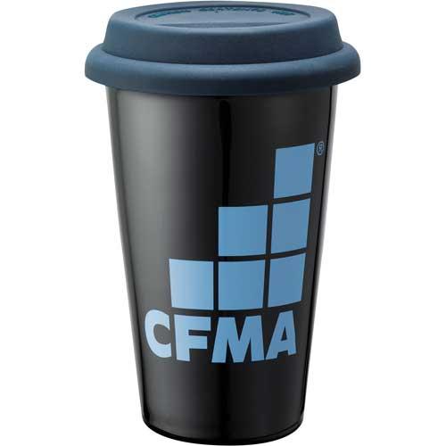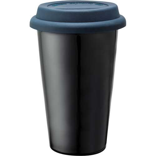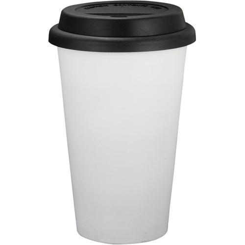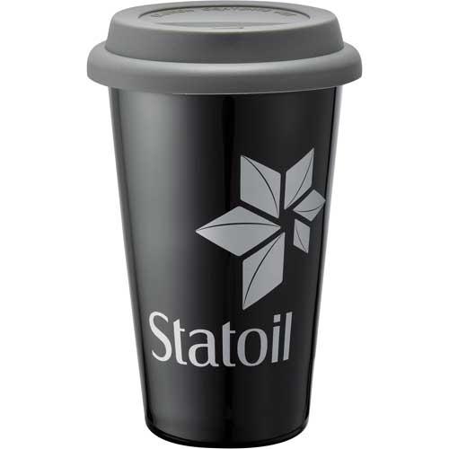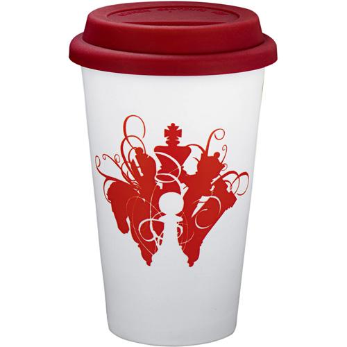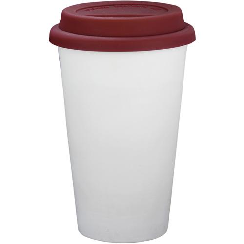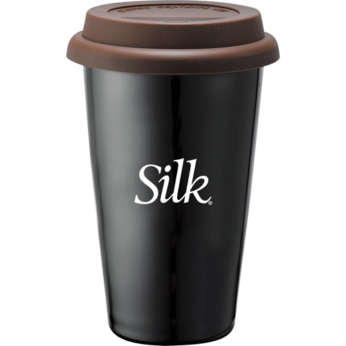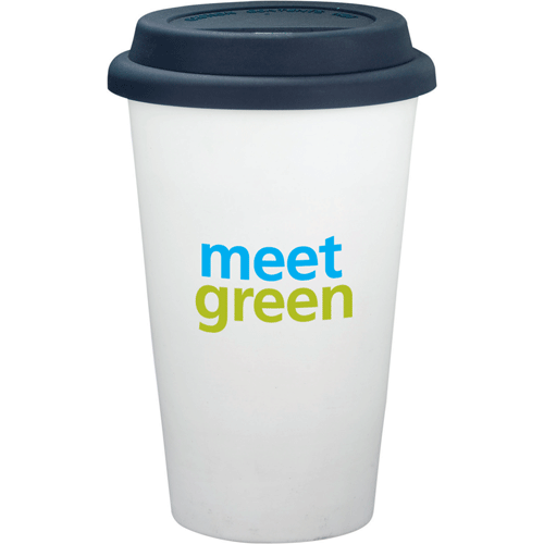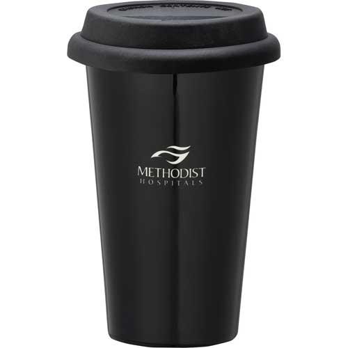 Silicone lid. Double-wall ceramic tumbler. 5.5" tall without the lid. Fits in most corporate coffee machines. Microwave Safe. Remove silicone lid before placing in the microwave. Choose between color imprinting or our new cutting edge dishwasher safe laser decorating method. 11 oz. Laser decorating cannot be done on the white mug.