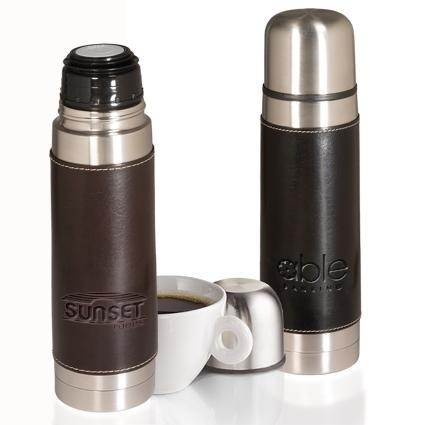 Richly-textured leather with top and bottom stitched accents and a brushed stainless steel finish. Stainless steel, leak-proof cap. Keeps drinks hot or cold for hours. Holds .5 liters/16.9 ounces.