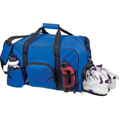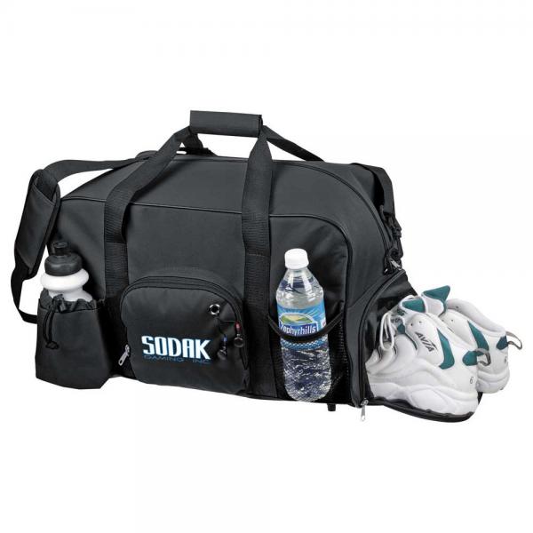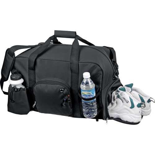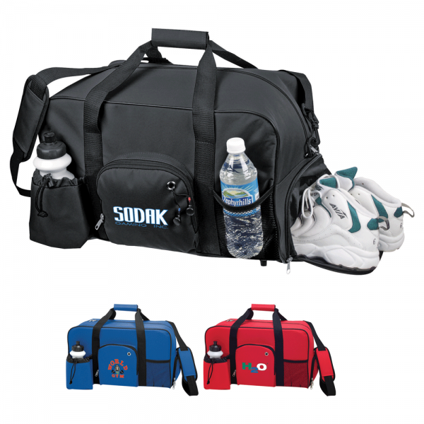 Zippered main compartment. Zippered front media pocket with earbud port. Front mesh pocket. Front pouch with adjustable drawstring and squeeze-top water bottle (not imprinted). Zippered side shoe compartment. Secure bottom board and five durable bottom feet. Velcro closure grip on handles. Double 20-1/2" reinforced handles. Detachable, adjustable padded shoulder strap. Additional accessories not included.