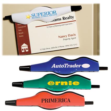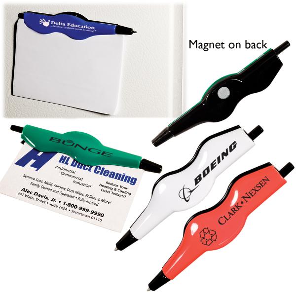 Plastic-body, click-action ballpoint pen with binder clip. Includes magnet embedded in back.