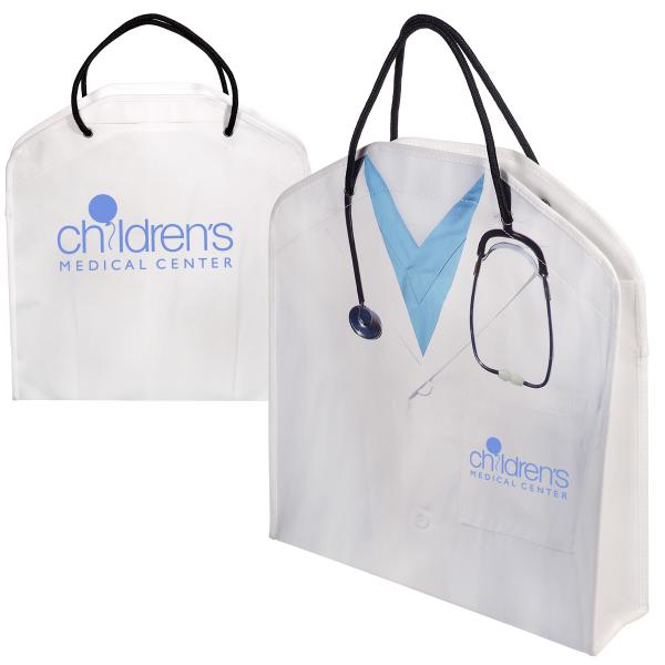 100GSM laminated non-woven fabric with imprinted lab coat and stethoscope graphic. Polypropylene rope handles. Reinforced metal eyelets.