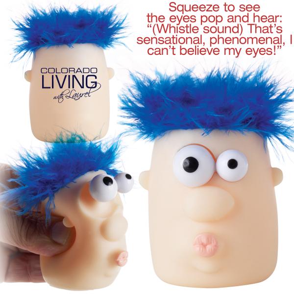 When squeezed, eyes pop out and a pre-recorded message is played: (Whistle sound) That’s sensational, phenomenal, I can’t believe my eyes! Stress relievers are not intended to be children’s or pet’s toys.