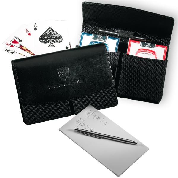 Ballistic nylon card carrying case with leather trim. Comes complete with two decks of playing cards, a pen, and a notepad.