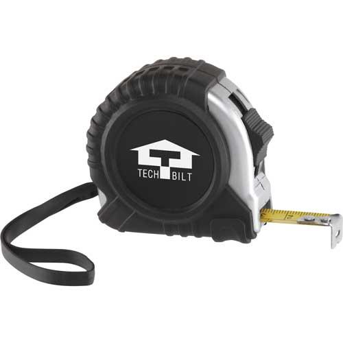 10-foot retractable tape measure. Standard and metric measurements. Rubber casing. Sturdy plastic wrist strap. Slide locking button locks tape in place. Metal belt-clip on back.