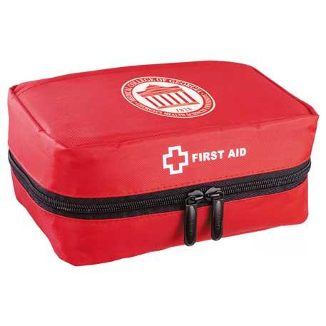 Stay Safe with this 42-piece kit. Multiple pockets and convenient hang loop. Includes zipped nylon case, Mylar blanket, scissors, tweezers, two latex gloves, two elastic bandages, two surgical pads, one triangular bandage, ten 3" bandages, four iodine prep pads, four alcohol prep pads, two antiseptic wipes, one roll tape, and ten cotton balls. Velcro tab on back of case for easy attachment to fixed objects.