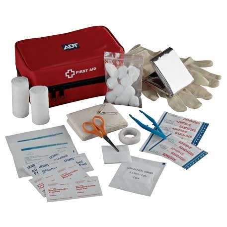- Includes zipped nylon case, Mylar blanket, scissors, tweezers, two latex gloves, two elastic bandages, two surgical pads, one triangular bandage, ten 3" bandages, four iodine prep pads, four alcohol prep pads, two antiseptic wipes, one roll tape, and ten cotton balls.
