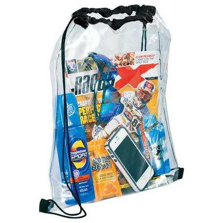 Clear material makes this bag perfect for stadium, event, workplace and other safety purposes. Open main compartment with drawstring rope closure.