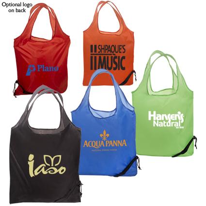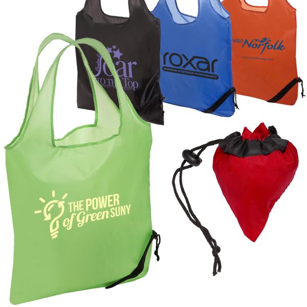 190t polyester shopper tote bag with corner pouch. Bag can be folded into drawstring pouch on corner forming a berry shape. Adjustable drawstring lock.