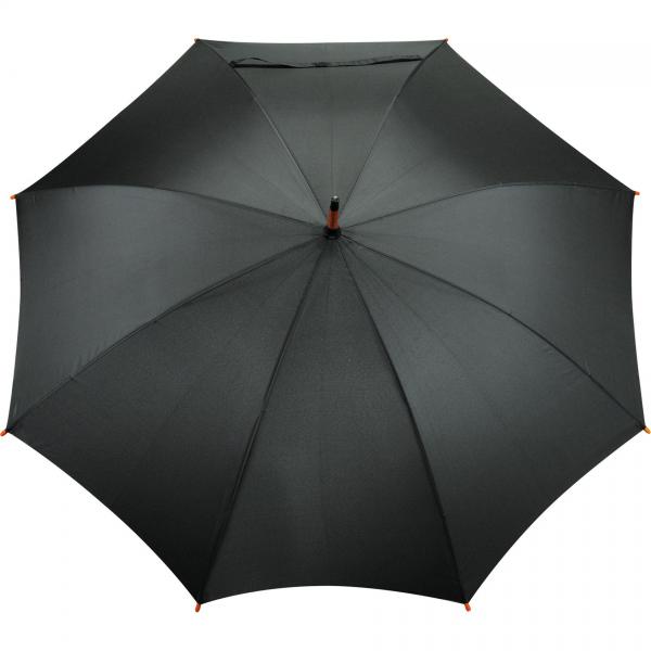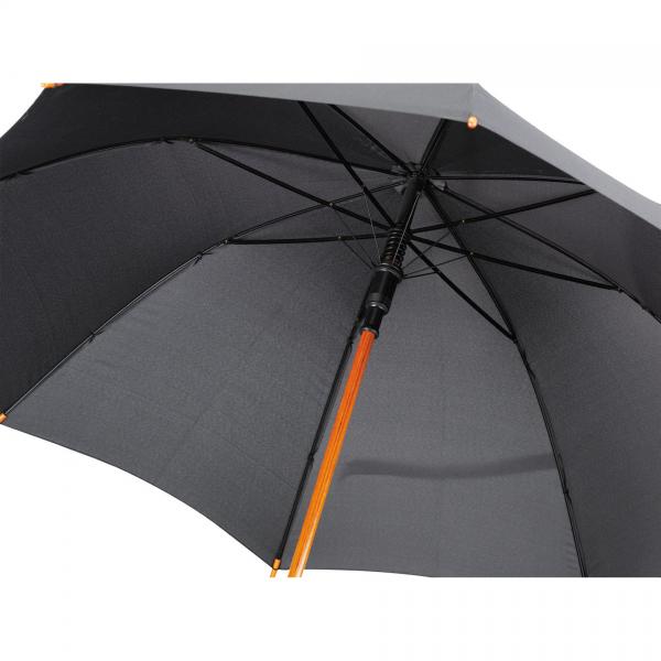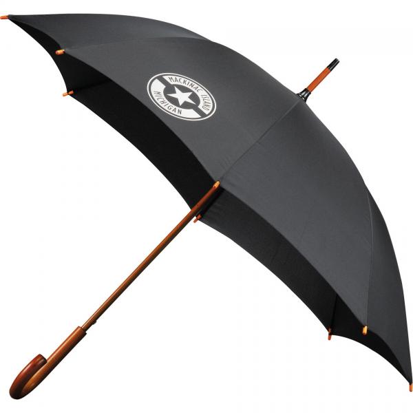 Canopy and matching case made of 51% recycled material. Full wood handle, shaft and tips. Automatic opening. Umbrella case includes a shoulder strap. Available for one-day turn with Sureship.