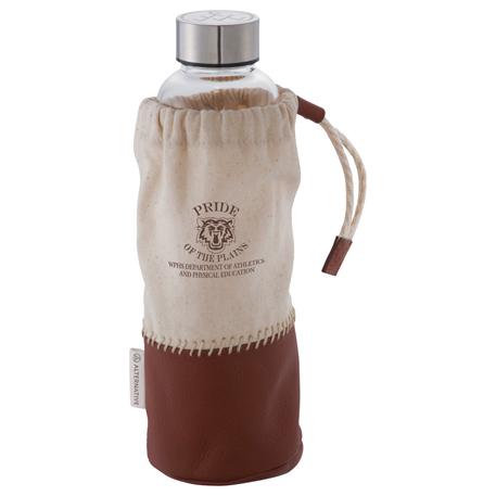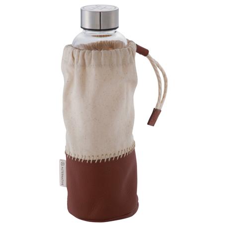Alternative moves through the world in a different way. Creating products people want to use every day; Alternative represents quality materials, durable construction and design clarity. Bottle is made from borosilicate glass and features an 18/8 stainless steel cap on lid. Protective pouch is made of cotton and leather with drawstring for the perfect fit. Alternative branding details include etching on cap and woven label on pouch. 18oz.