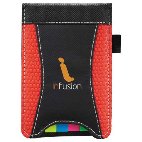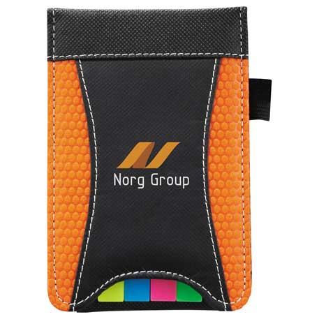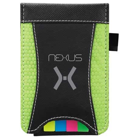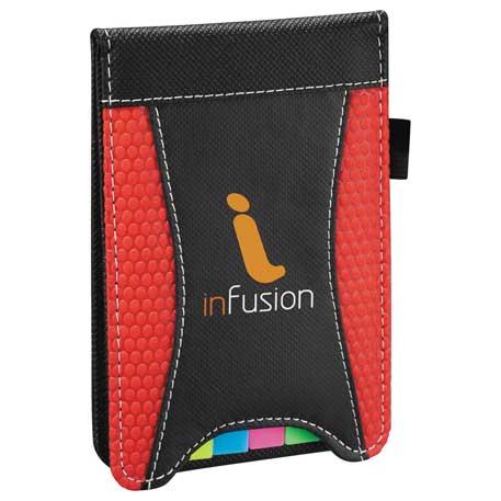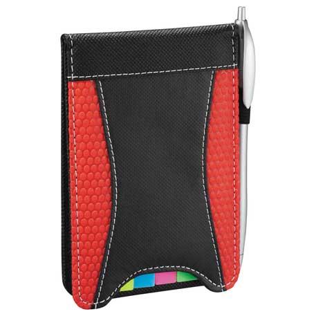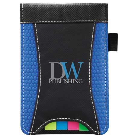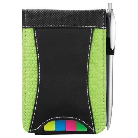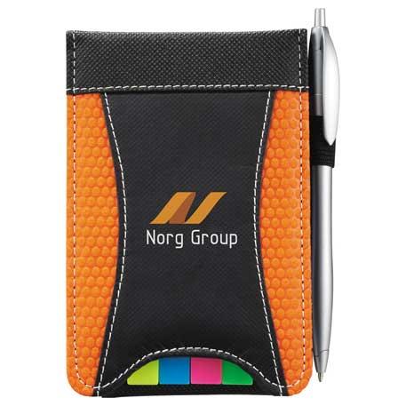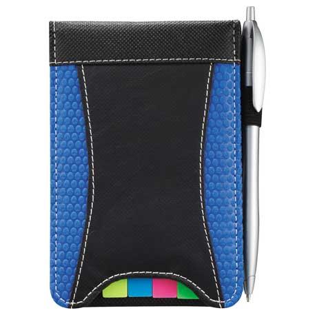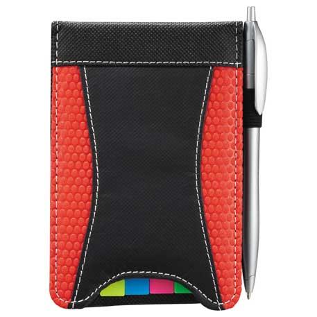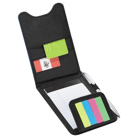 30 ruled page notepad. Four assorted color sticky flags. Business card pockets and elastic pen loop. Pen not included.