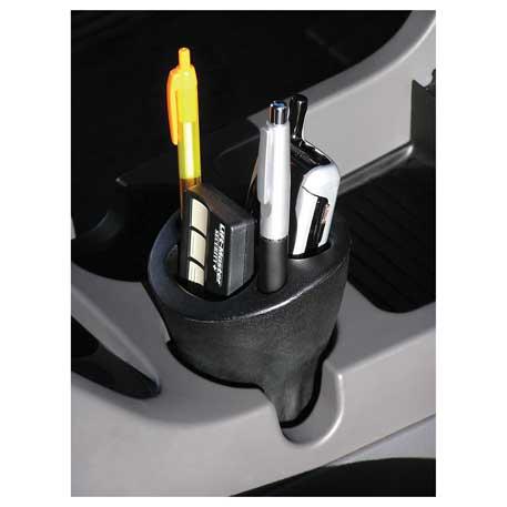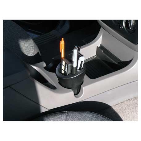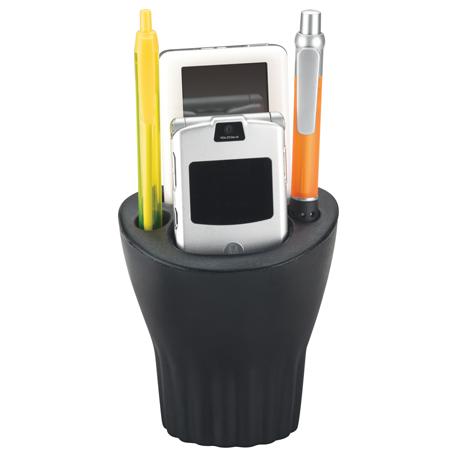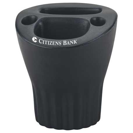 Fits in any standard size auto cup holder. 2 organizer slots for personal items and accessories. 2 pen slots. Hole in base for device charger cable. Accessories not included. Material varies in density, size & weight due to mold process which may prevent precise and uniform imprints. Imprints may break up. No half-tones