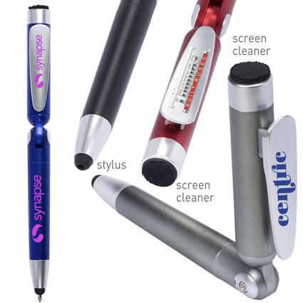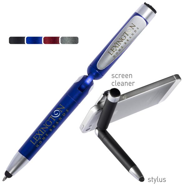 ABS plastic twist-action ballpoint pen with ratcheted hinge that forms a stand. Soft silicone tip for use with touchscreen devices, and screen cleaner on cap. Clips to mobile devices/cell phones and fold to create a stand.