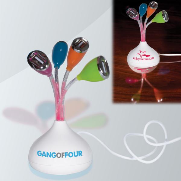 Connects up to four devices. Omni-directional flexible ports allow for easy access. Port cords light from base when unit is connected to your USB port. 29" cord.