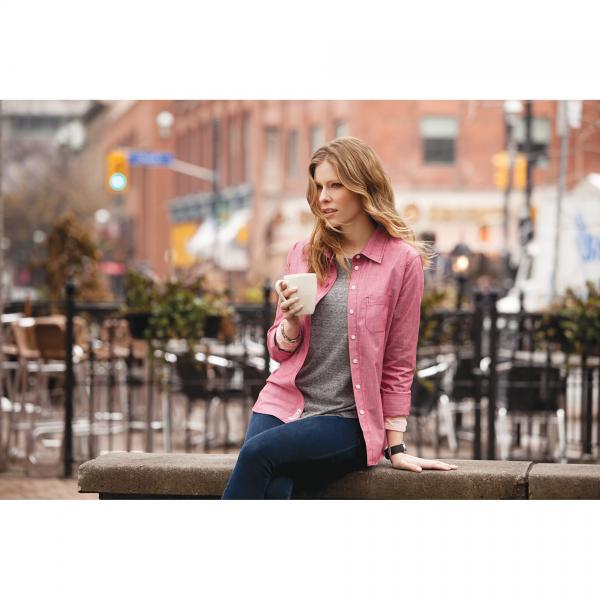 Casual style for inside or outdoors has never been easier to wear. This versatile, wrinkle-resistant shirt features contrast logo buttons, upper patch pockets and the womens style features a roll up sleeve tab with button closure for a three-quarter sleeve look.