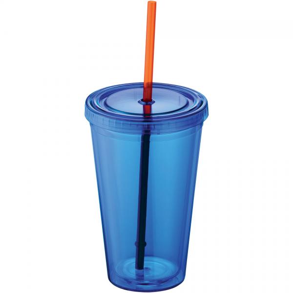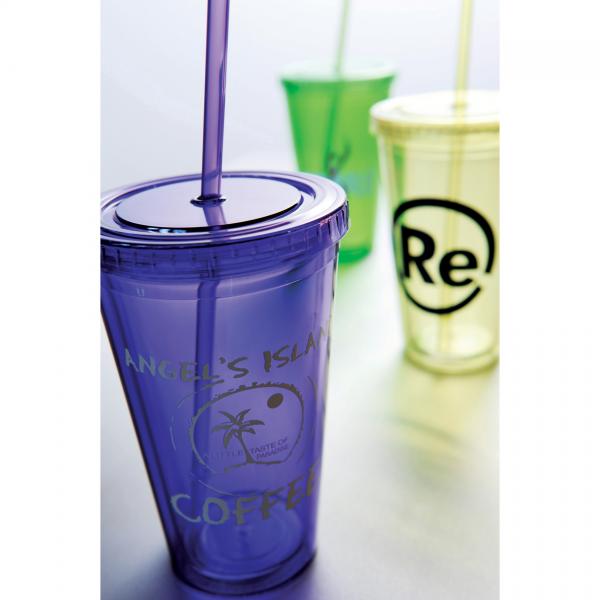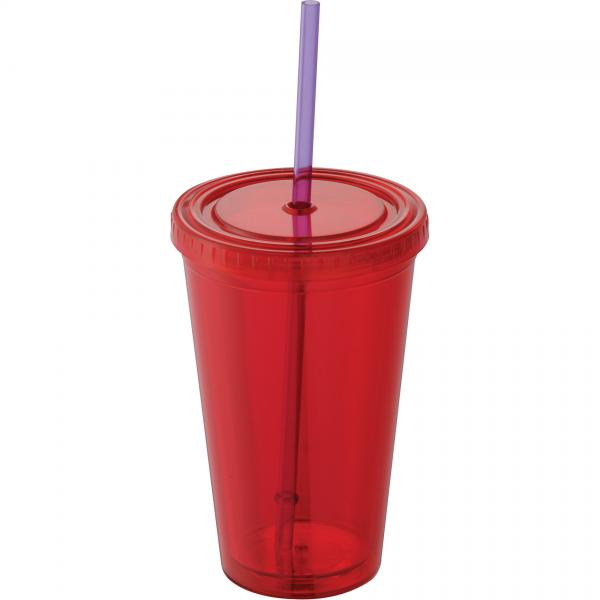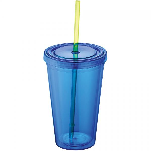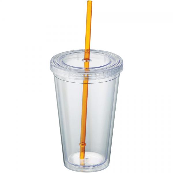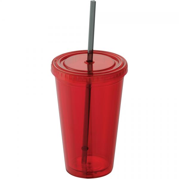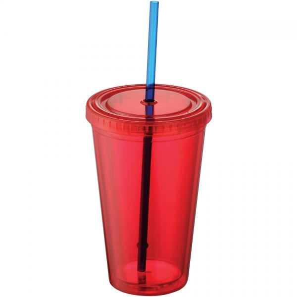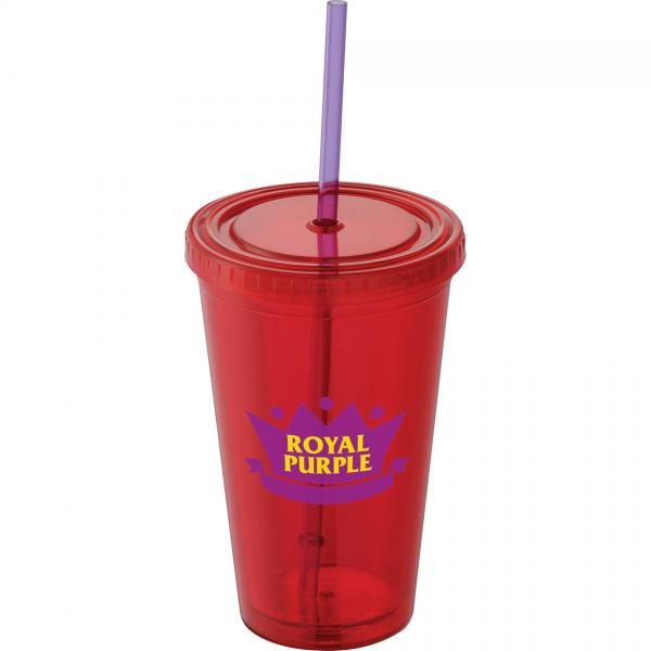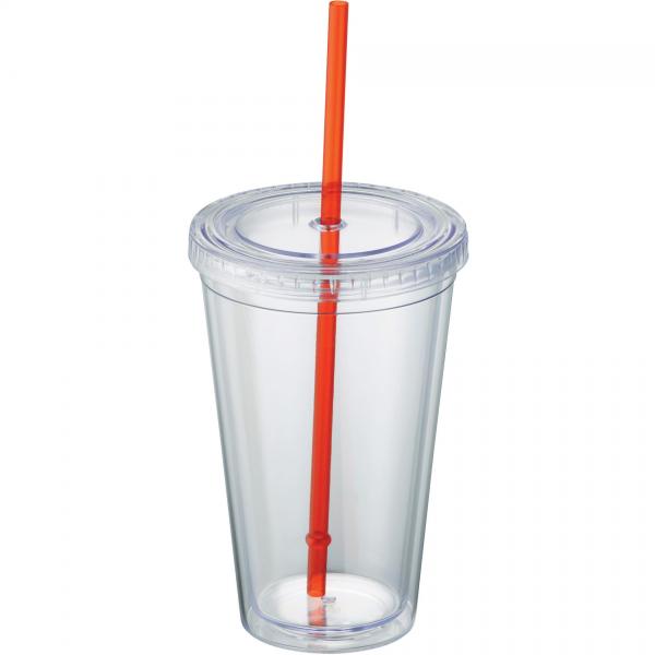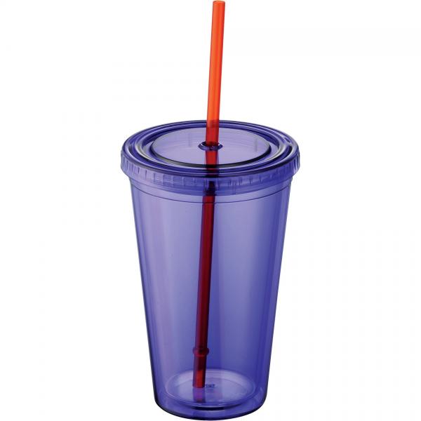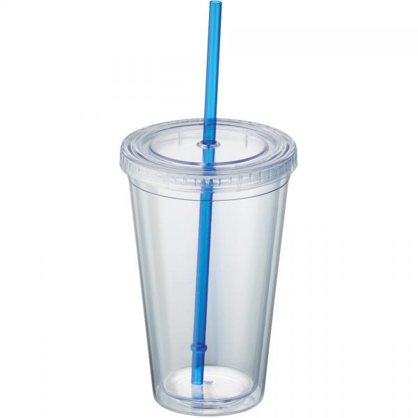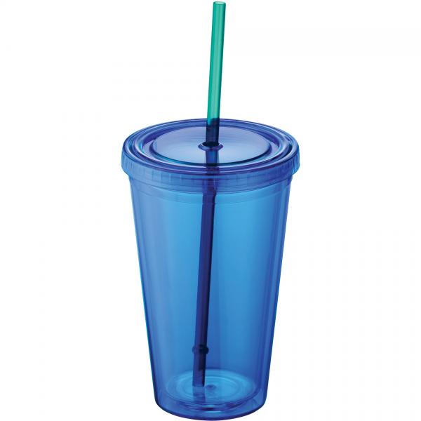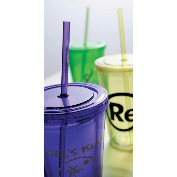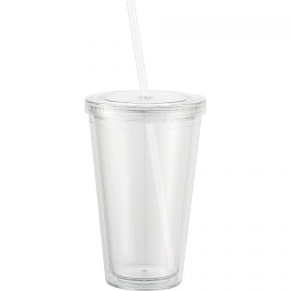 Double-wall acrylic tumbler and straw with stopper. Product ships with matching color straw unless specified otherwise in purchase order. BPA free. 16oz.