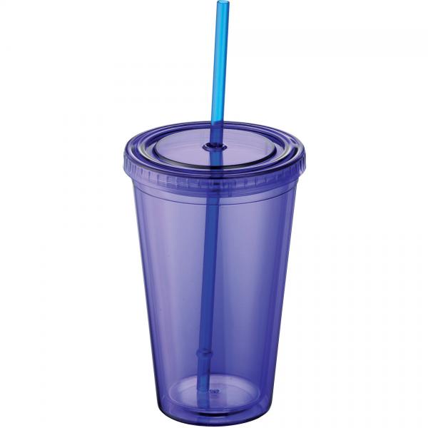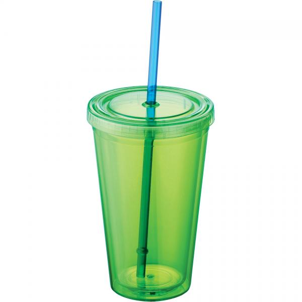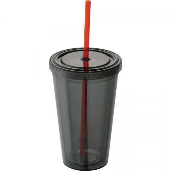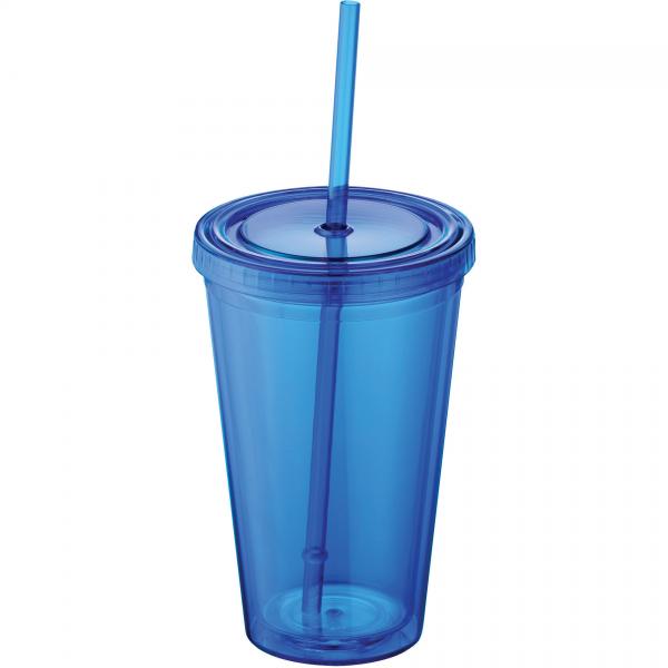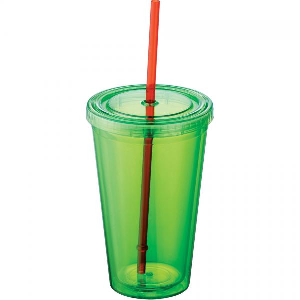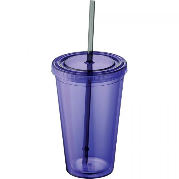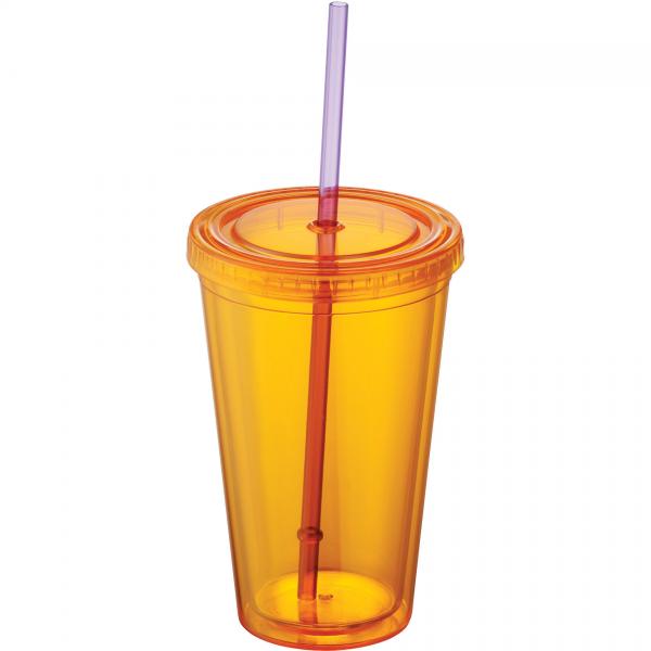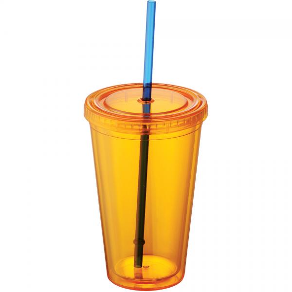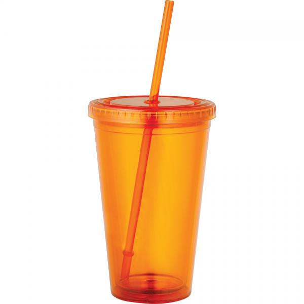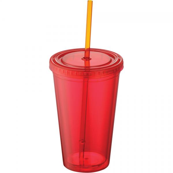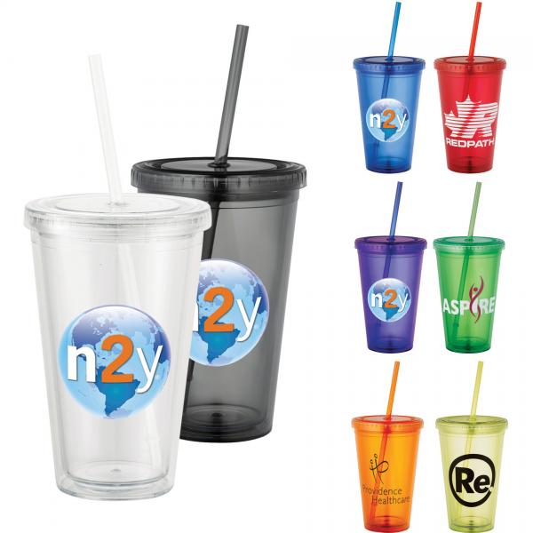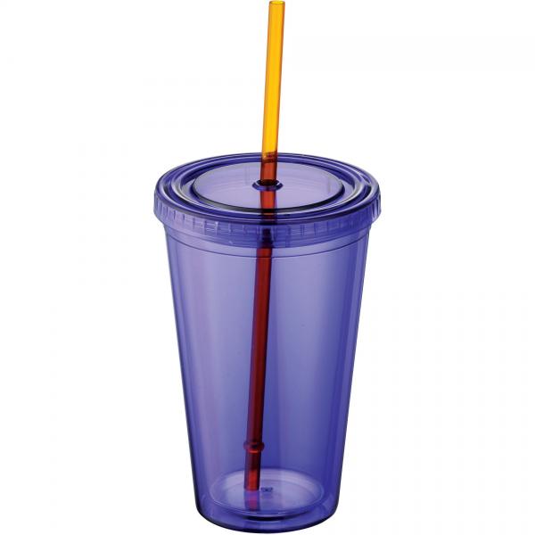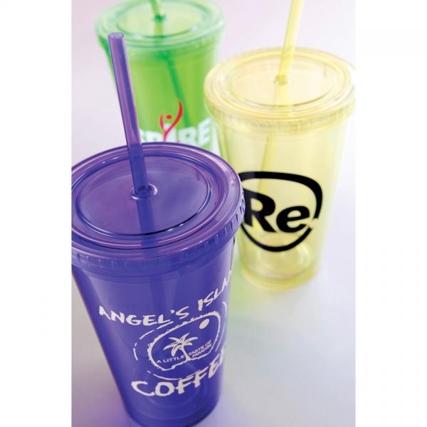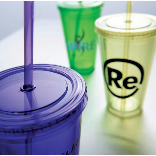 Double-wall acrylic tumbler and straw with stopper. Product ships with matching color straw unless specified otherwise in purchase order. BPA free. 16oz.