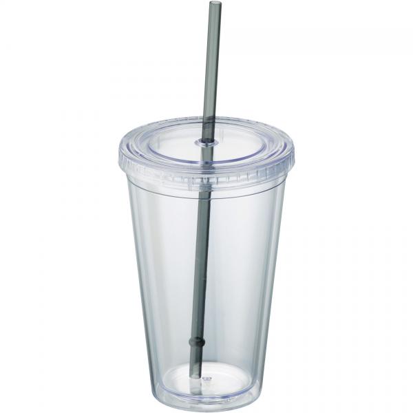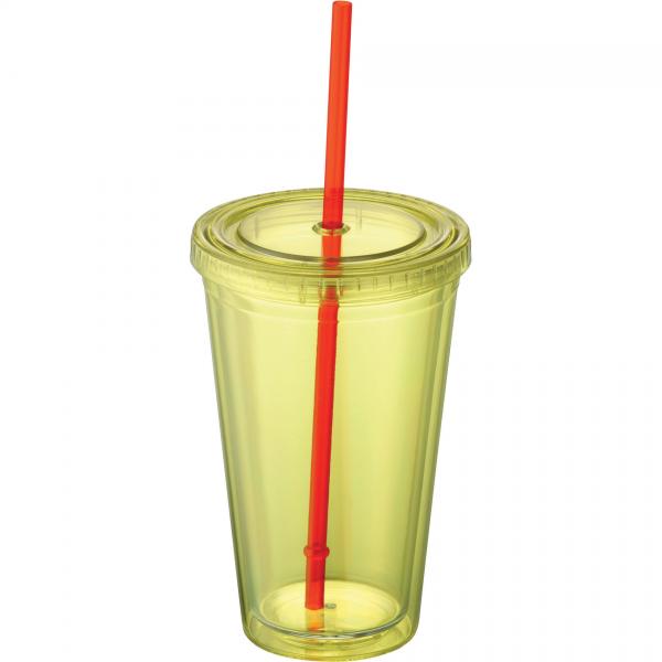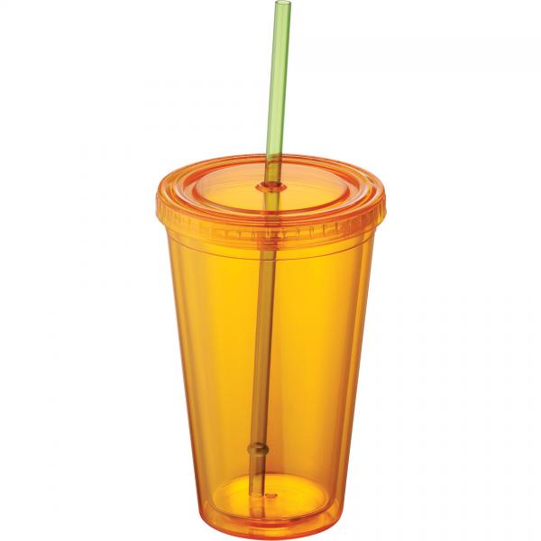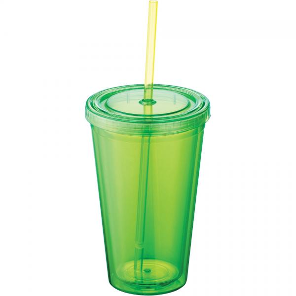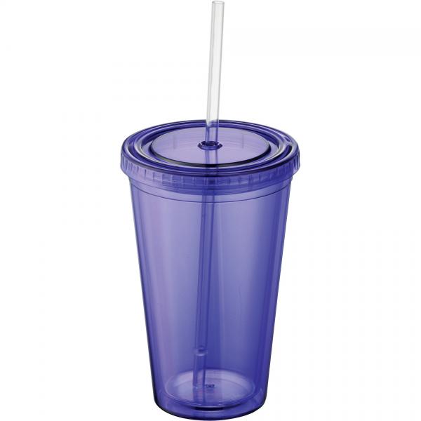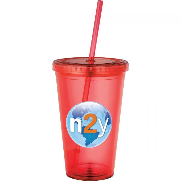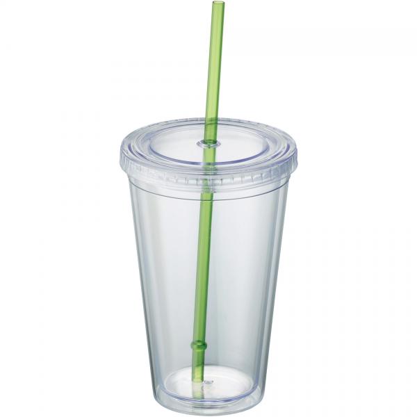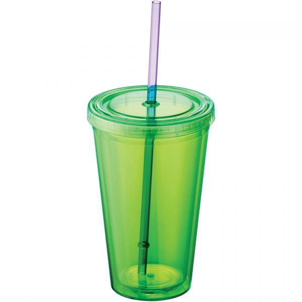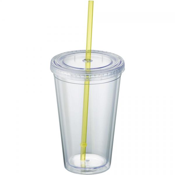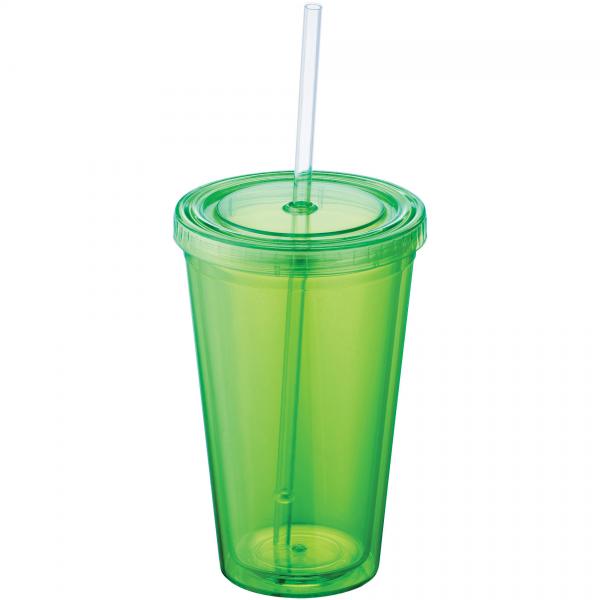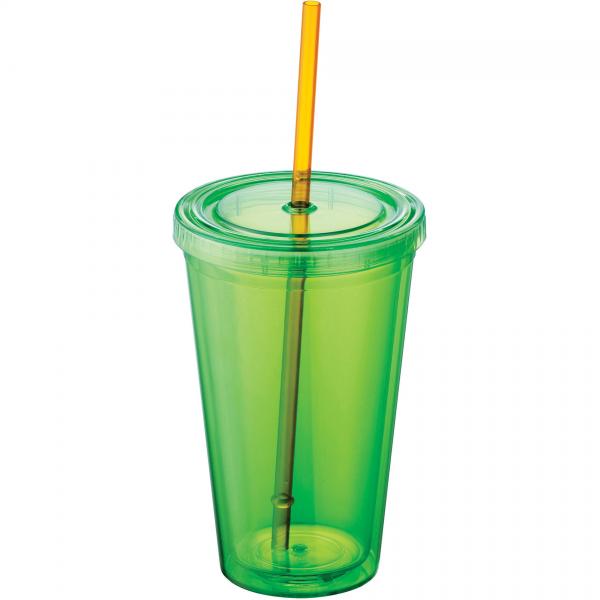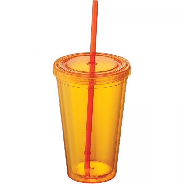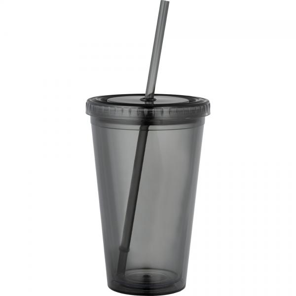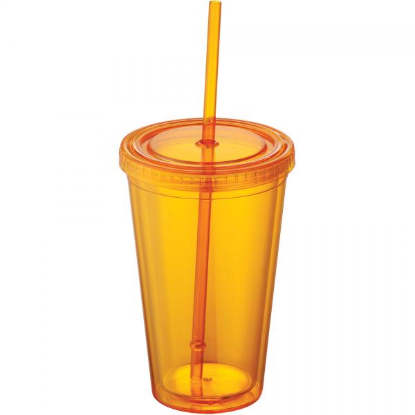 Double-wall acrylic tumbler and straw with stopper. Product ships with matching color straw unless specified otherwise in purchase order. BPA free. 16oz.