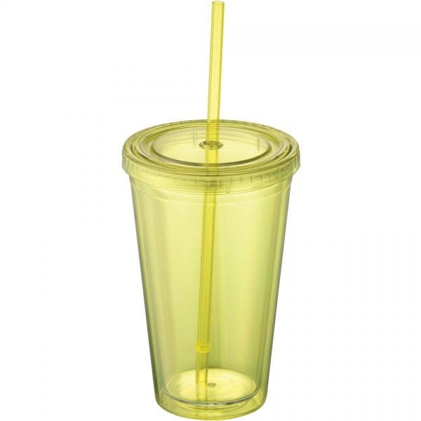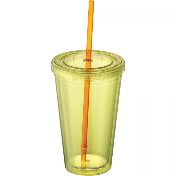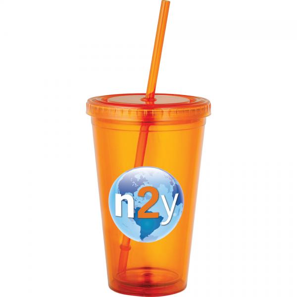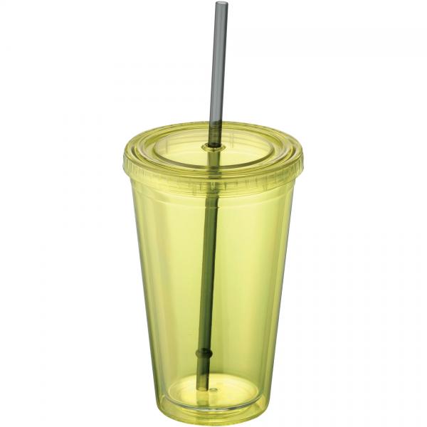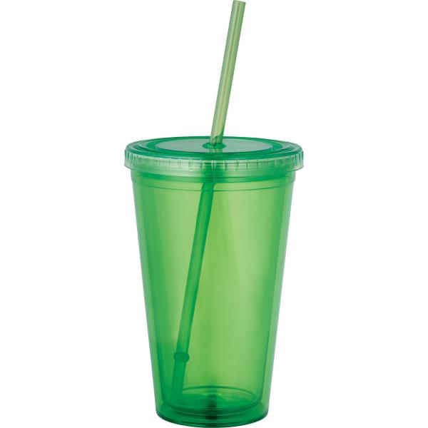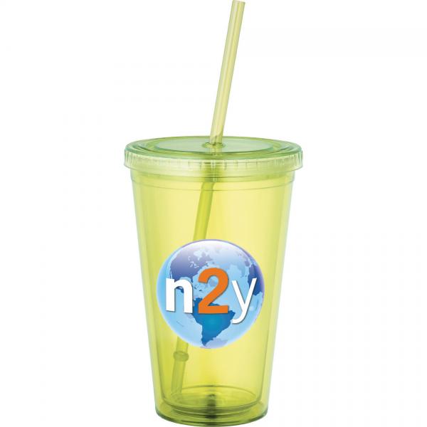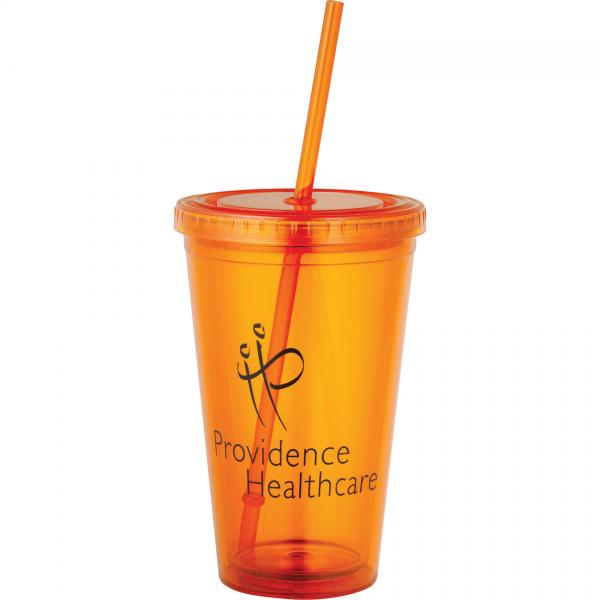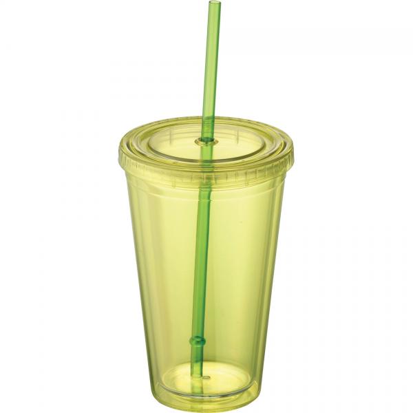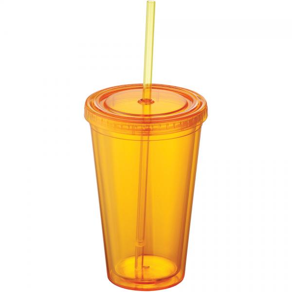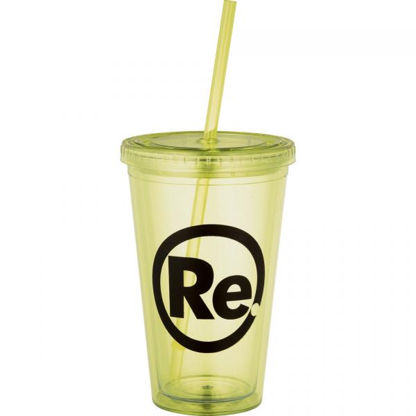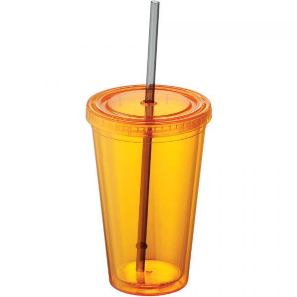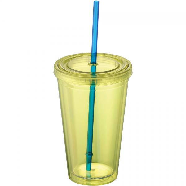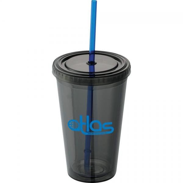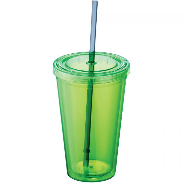 Double-wall acrylic tumbler and straw with stopper. Product ships with matching color straw unless specified otherwise in purchase order. BPA free. 16oz.