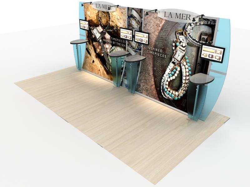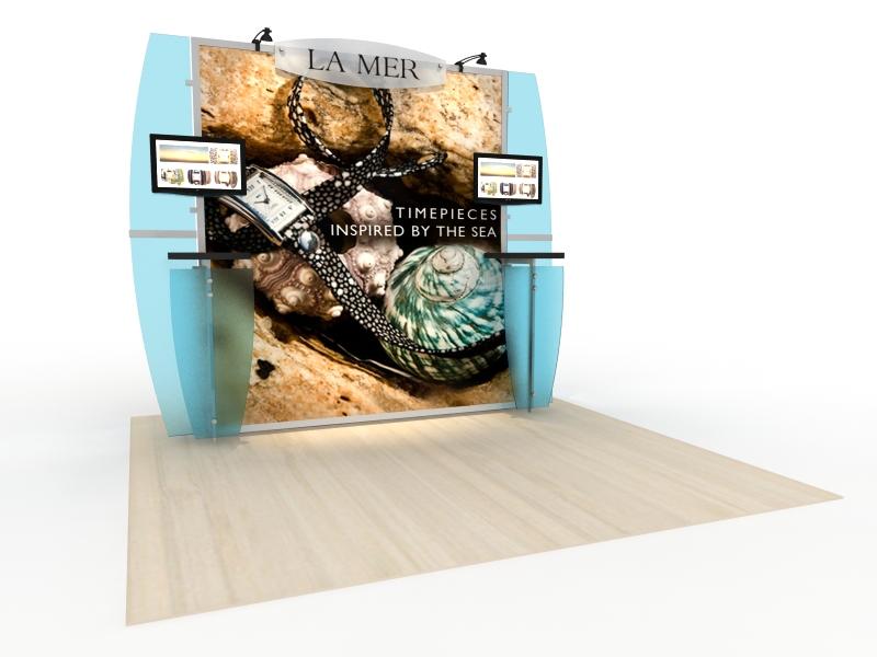 Become alluring with the Magellan Magic! Designed to draw attention and conjure up leads like no other. The VK-2123 Magellan Magic’s curved aluminum frame and large format tension fabric graphics make a dramatic statement at any trade show. Display options include workstations, monitor mounts, headers, and a matching portable counter with storage.