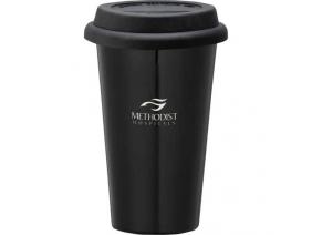 Leeds 1622-41 | Double-Wall Ceramic Tumbler 11oz: Silicone lid. Double-wall ceramic tumbler. 5.5" tall without the lid. Fits in most corporate coffee machines. Microwave Safe. Remove silicone lid before placing in the microwave. Choose between color imprinting or our new cutting edge dishwasher safe laser decorating method. 11 oz. Laser decorating cannot be done on the white mug. |