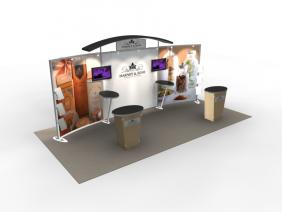 VK-2044 20 Ft Visionary Designs: No hybrid trade show displays have been more iconic than the Visionary Designs VK-1032 and VK-2044. Nearly every day someone new falls in love with this attractive and versatile exhibit. That’s not surprising. The VK-1032 combines large tension fabric graphics, downlighting, large monitor capability, and ample storage into a stunning 10 ft. and/or 20 ft. display. The freestanding modular workstation makes the package even more irresistible and practical. Click on the See Photos link to see select examples of how this display has been modified to capture the trade show marketing goals of many successful companies. For more information, send us an email using the Send Me More Information button or give us a call. |